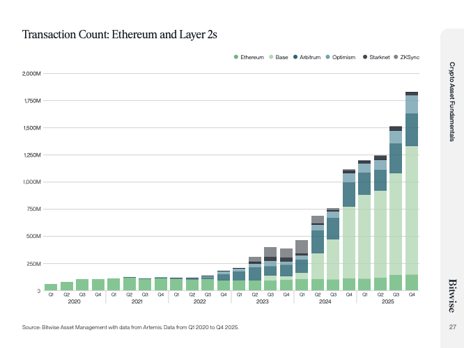 Bitwise认为,这种「数据涨、价格跌」的背离是典型的市场底部信号,预示着2026年Q1风险资产将迎来报復性反弹。