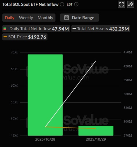 根据 SoSoValue 数据,在次一日上市的Grayscale推出的 Solana ETF 表现相对疲弱,净流入约 140 万美元。经过28及29日两天,两只Solana ETF 合计净流入达 1.174 亿美元,总交易量已达 7,950 万美元。