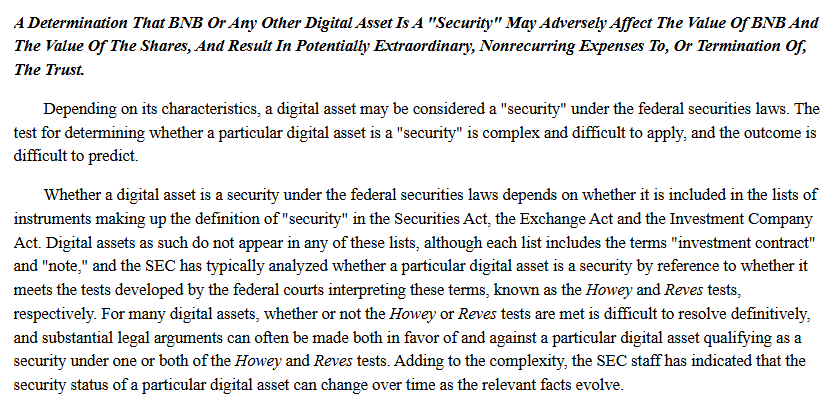VanEck在最新文件中的风险因素部分则指出,若 BNB 或其他数字资产最终被界定为「证券」,将可能对 BNB 价格及基金单位价值造成不利影响,并可能导致信托产生异常费用甚至被迫终止。依据 SEC 的规范,该信托亦可能被视为未注册的「投资公司」,从而面临清算风险。
