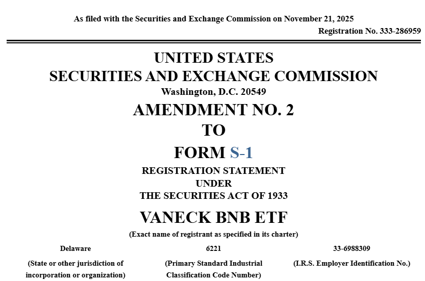BNB 现货 ETF 推进审批 VanEck 更新 S-1 文件 取消质押设计