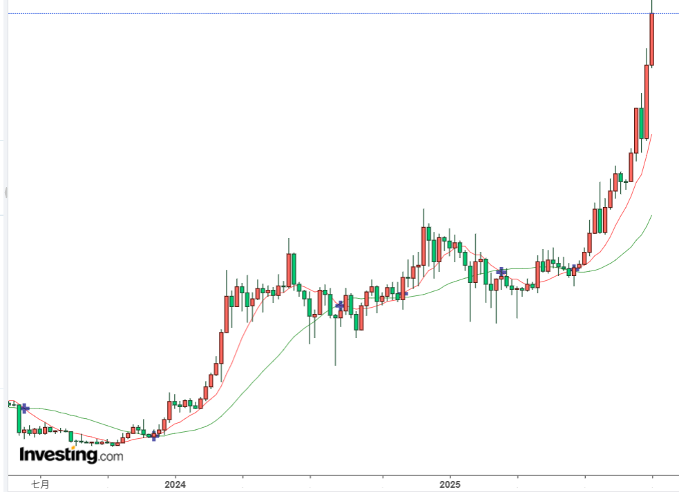 2025 年 5 月,20 日 MA 上穿 100 日 MA 形成黄金交叉,自此一路震荡上扬,并自 7 月以来不断刷新高点。