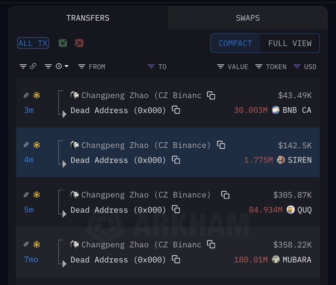这是他相隔 7 个月后再次进行代币销毁,包含 QUQ、SIREN、BNBCARD 等币种,已被转入销毁地址、永久退出流通。