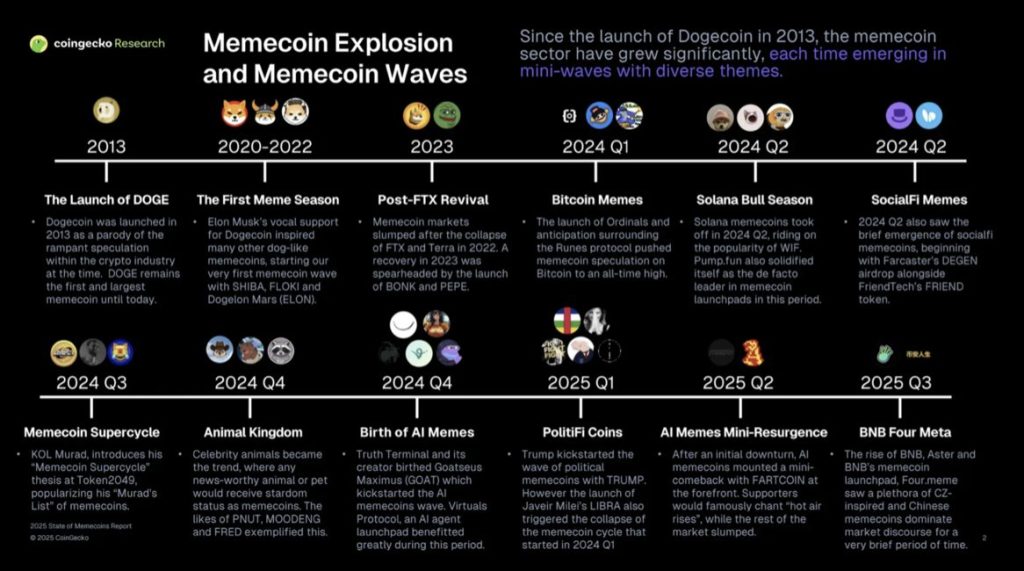 这表明,市场依然存在明确的偏好对象,但随着板块不断演化,推动看涨动能的因素也在发生变化。CoinGecko自身对迷因币浪潮的时间线梳理,清楚地展现了这一转变。