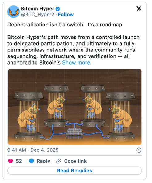 团队还披露了 Bitcoin Hyper 的逐步去中心化路线图:初期采用相对可控的启动架构以确保上线稳定性;随后循序开放网络权限,让任何人都能参与节点运行与治理;最终过渡为完全由社区驱动、无需许可的去中心化网络。