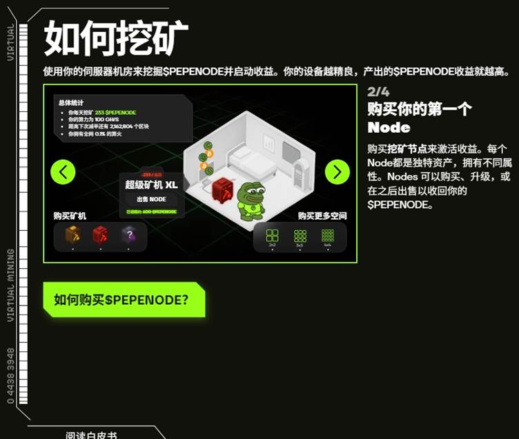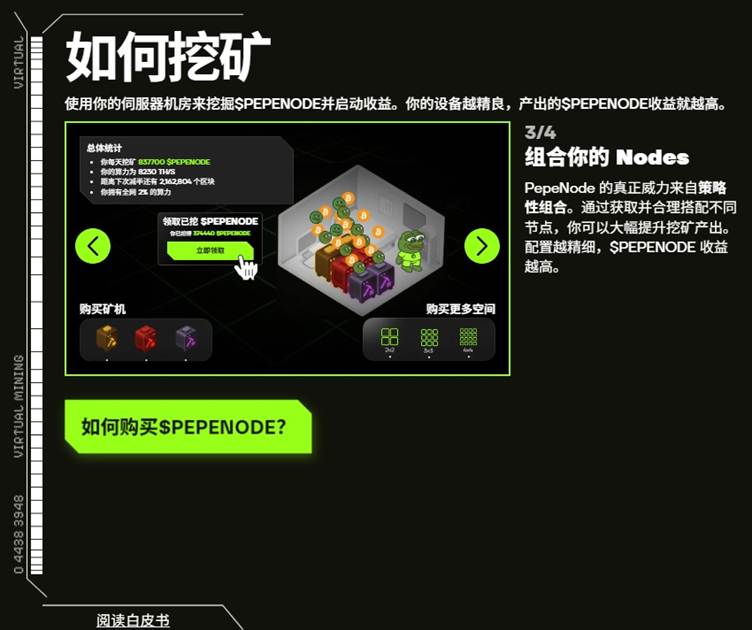在游戏中,玩家从一个空置的机房开始,消耗 PEPENODE 代币来布置虚拟设备和节点。这正是策略证明模型的核心所在:由于游戏机制鼓励算法优化,单纯的“重氪”并不能保证成功。