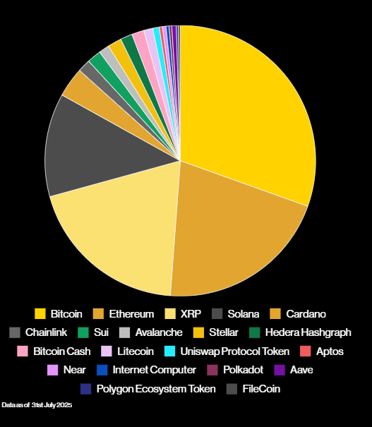 自 2022 年 7 月 1 日起,基金成分由 CoinDesk 5 指数(CD5) 所包含的数字资产组成,并会根据指数的定期调整而进行再平衡,但在特定情况下,管理方有权酌情排除某些数字资产。CD5 由 CoinDesk Indices, Inc. 设计与管理(在此作为“指数提供方”)。根据目前官方资料,目前成份包括比特币、以太坊、XRP、Solana以及Cardano。