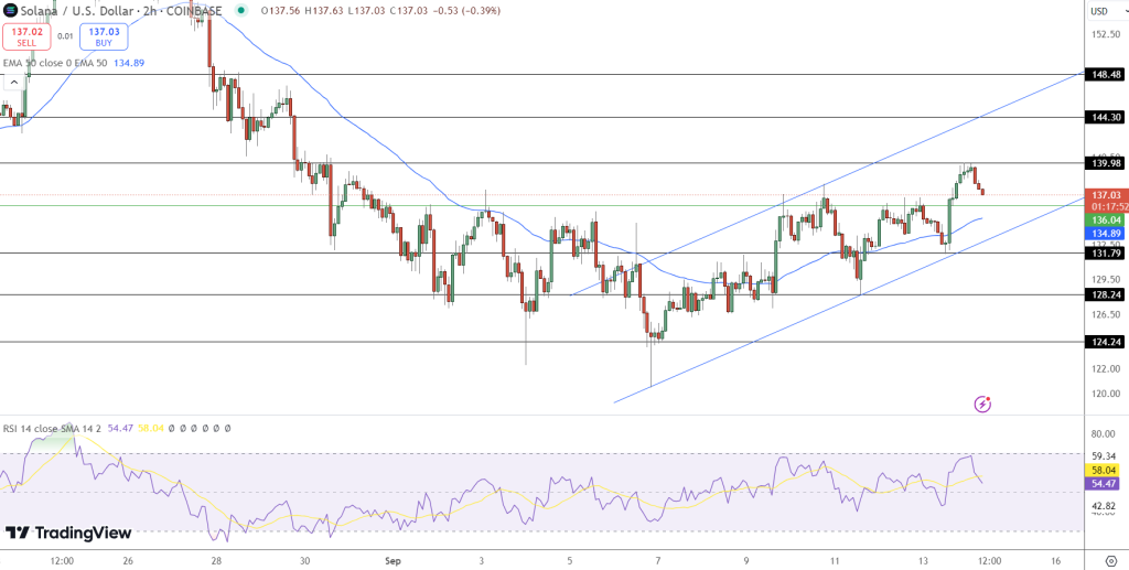 Solana (SOL/USD)当前交易价格为 137.03 美元,日内下跌 1.35%,但仍处于上涨通道内,在 136.04 美元的支撑位附近找到强劲支持。