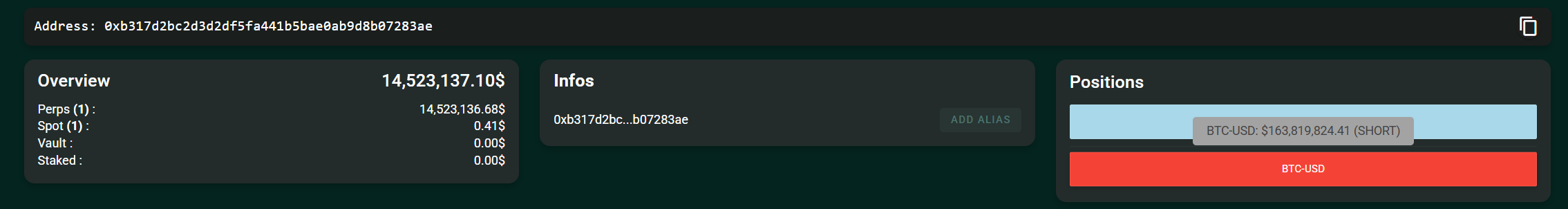 然而,这番回应并未平息外界质疑。更讽刺的是,被指与 Jin 相关的 Hyperliquid 账户,同日又开出新空单,根据链上追踪工具 HypurrScan 的记录,他此次投入约 1,600 万美元,以 10 倍杠杆开出比特币空单,名义头寸超过 1.6 亿美元。