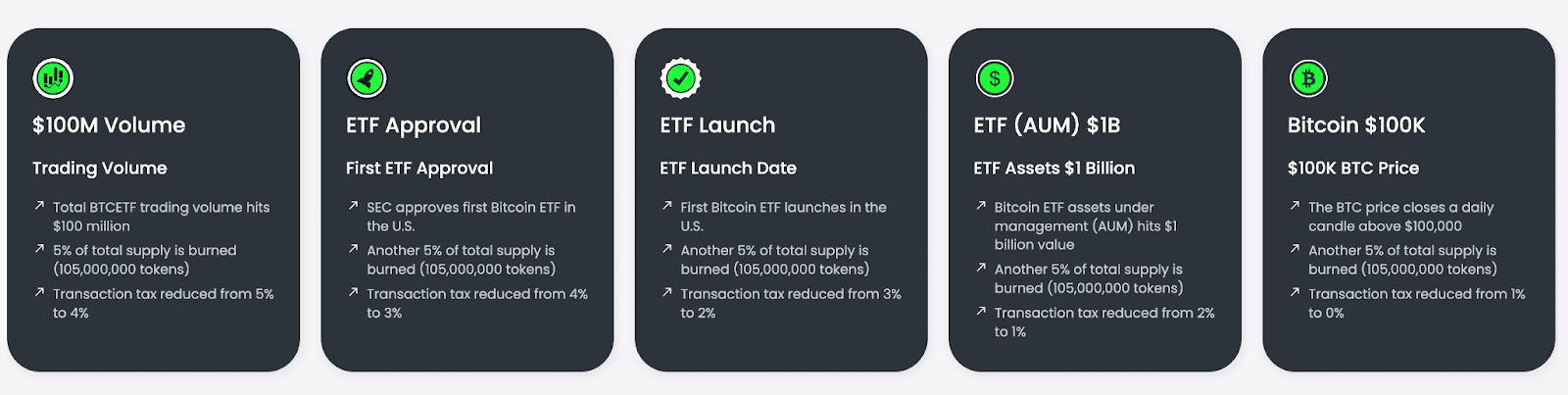 基于以太坊区块链,$BTCETF代币在在去中心化交易所(DEXs)上线时最初包含燃烧税。随着每个里程碑的实现,税收逐步减少1%。