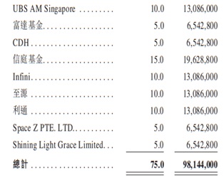 不过,在过往三年公司仍处于亏损状态,分别录得亏损5.9亿元、5.8亿元及11.9亿元。今年首6个月亏损5.1亿元。至于今次招股所引入的9名基石投资者分别为UBS、富达、信庭基金、CDH、Infini、至源控股、利通、Space Z PTE及Shining Light Grace。