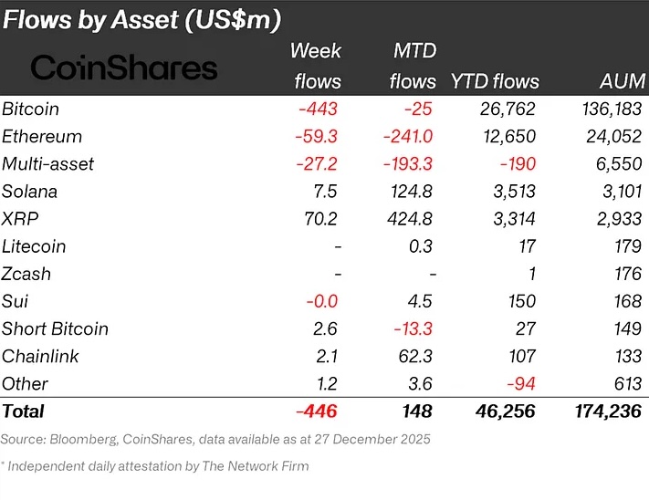 加密货币市场在2025年年终之际展现出複杂的资金迁徙特徵。根据 CoinShares 最新发佈的数据显示,全球数位资产投资产品在上週录得高达4.46亿美元的淨流出,这使得自10月中旬以来的累计赎回金额推升至32亿美元。儘管全年度的资金流入总额达到463亿美元,