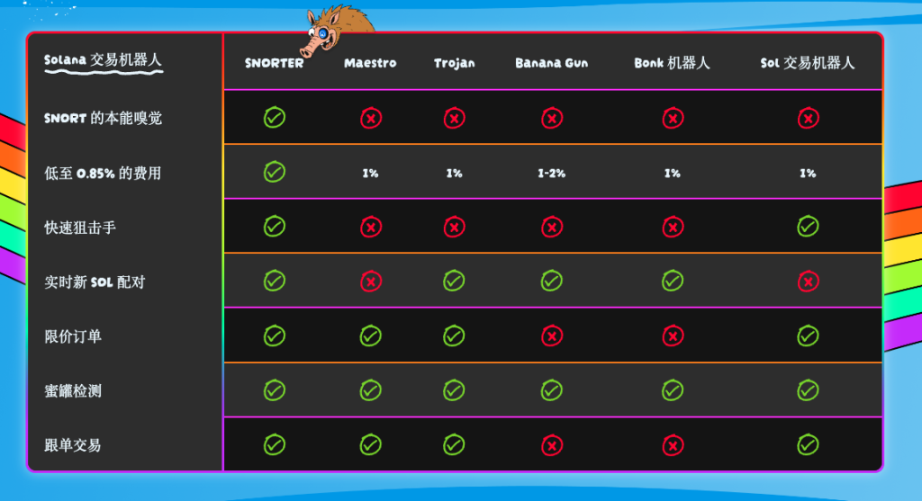 Snorter直接整合至 Telegram,让用户在群组聊天中即时取得市场数据与分析,打造边聊边交易的极速体验。其交易手续费低至 0.85%,比 BonkBot、Maestro 与 Trojan 等同类工具更具优势。核心功能包括抗 MEV 抢跑机制、跟单交易、反拉地毯保护协议与限价单狙击等,建构出一套完整的智慧交易生态系统。此外,其质押机制更祭献高达218%年化报酬率APY,为早期支持者提供极具吸引力的收益诱因。
