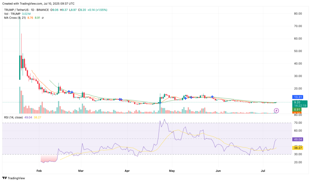 官方特朗普币目前交易价格为9.19美元,根据CoinMarketCap的数据,24小时涨幅为6.37%。其交易量在24小时内上涨186%,达到5.1亿美元。在孙宇晨1亿美元承诺后,特朗普币图表显示出,在稳定价格行为后的潜在反弹,这个动作表明,围绕特朗普币叙事的动力正在增强。