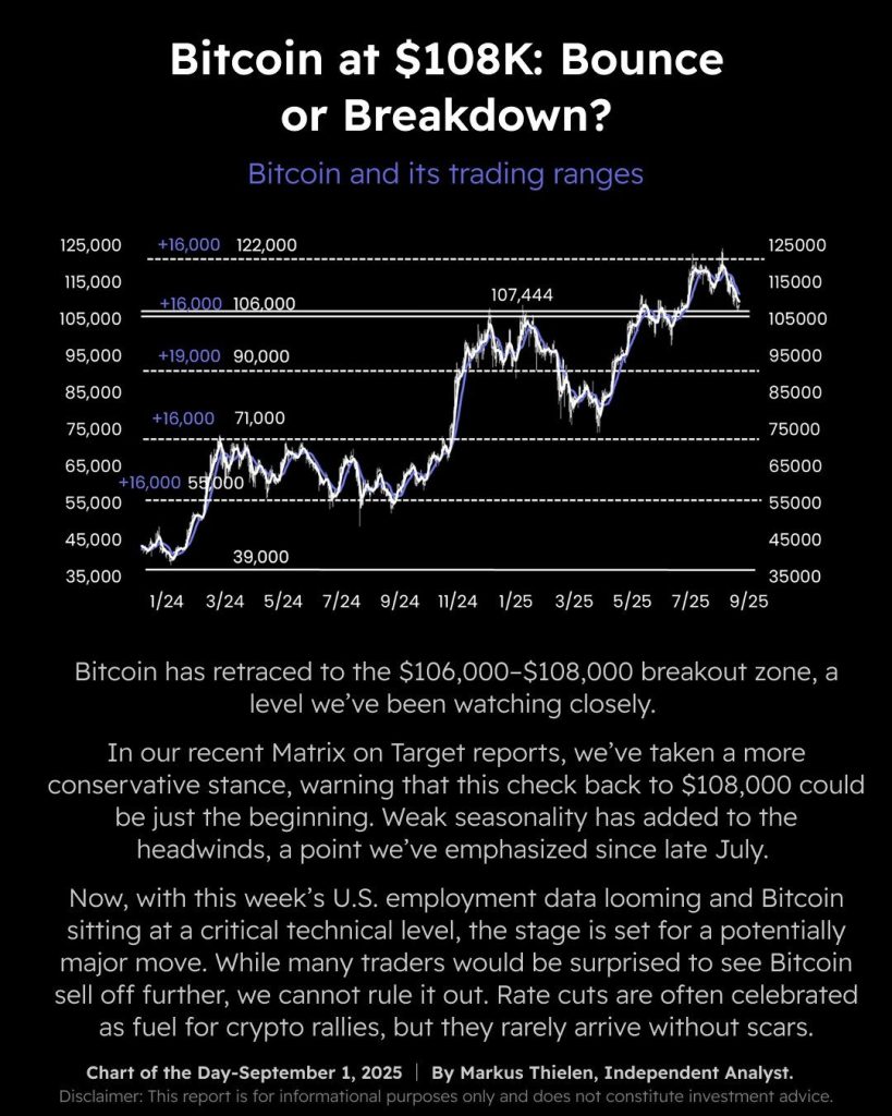在近期的 Matrix on Target 报告中,我们采取了更为保守的立场,警告这次回落到 10.8 万美元可能只是开始。季节性疲软进一步加剧了阻力,这是我们自 7 月下旬以来一直强调的。