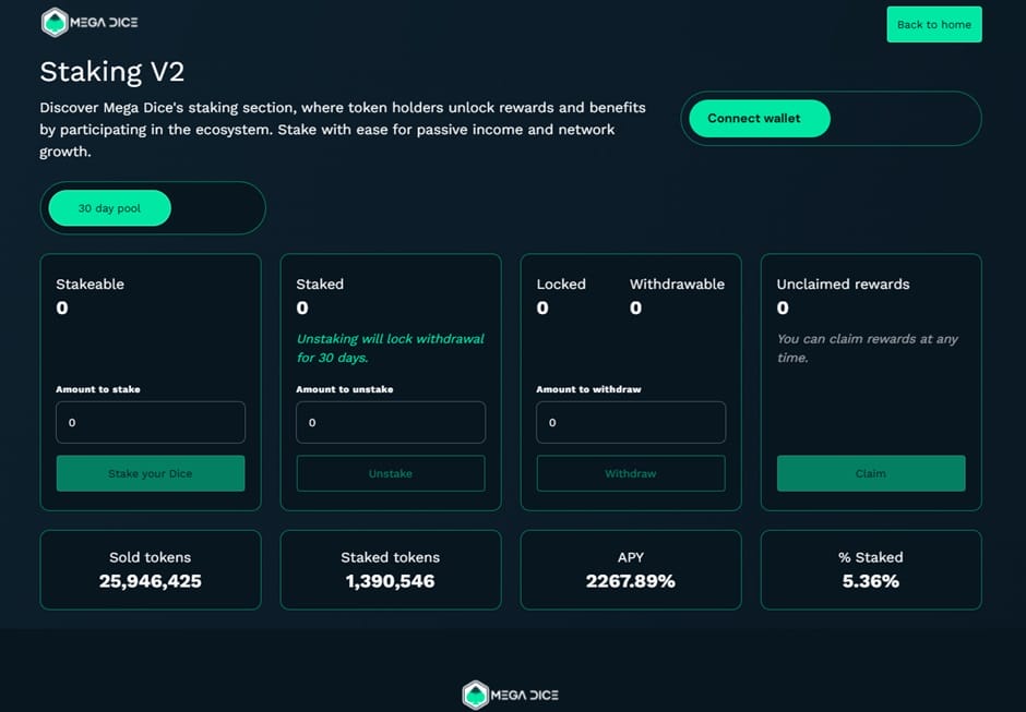 为了支持上线,该项目同时销毁了 1.28 亿枚 $DICE 代币,并推出了第二版质押平台。Mega Dice 的 V2 质押平台为质押者提供高达 2,368% 的年化收益率 (APY),并设有30天和90天的固定期限质押池,早期参与者还可获得额外奖励。