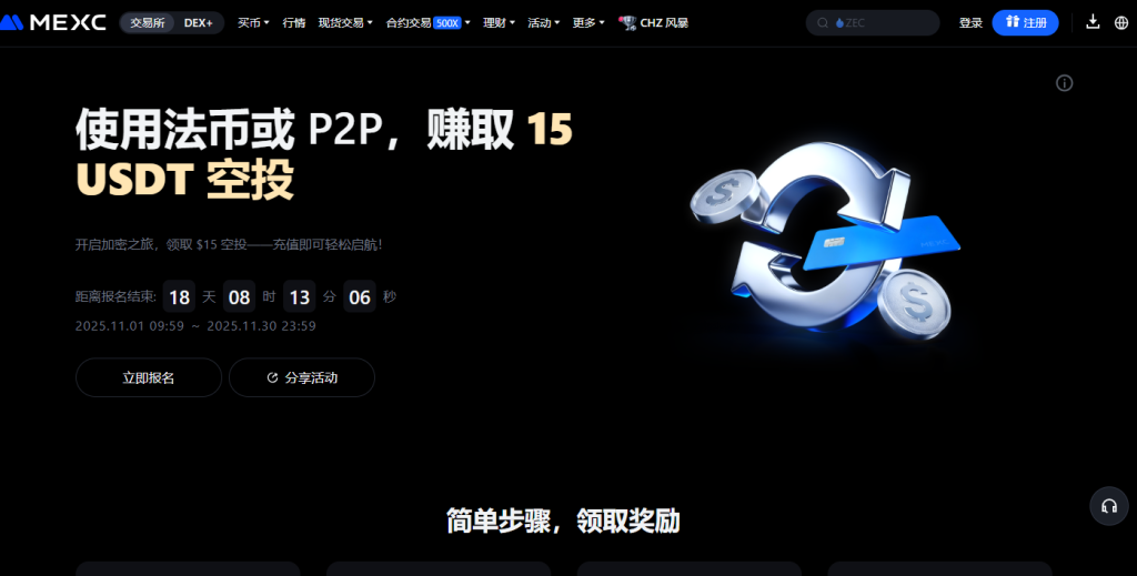 有兴趣的用户可访问MEXC官方网站,注册账户并完成法币或P2P入金任务,即可领取15 USDT空投奖励,并获得幸运抽奖资格。活动将于12月1日截止,所有奖励均以USDT形式发放,可即时使用或提现。