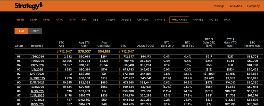 比特币近日回落至87,00美元附近,全球最大比特币上市企业持有者微策略Strategy(MSTR)再次展现其激进的国库战略。根据最新向美国证券交易委员会(SEC)提交的监管文件,Strategy在2026年1月20日至1月25日间,斥资约2.64亿美元增持2,932枚BTC。