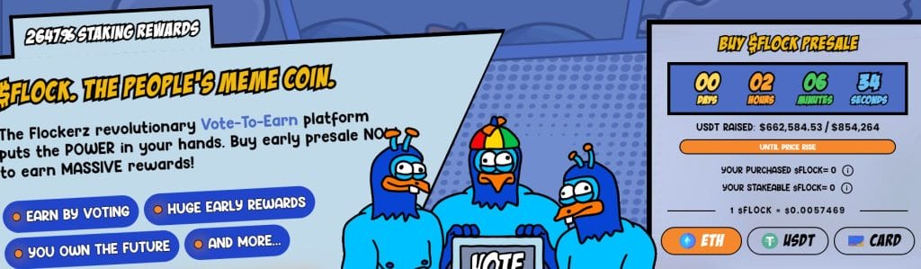 Flockerz ($FLOCK) 正迅速成为模因币领域的新星,其独特的“投票即赚”机制赋予社区更多决策权。随着 $FLOCK 预售持续进行,该项目已筹集到 66.2 万美元,显示出强劲的市场兴趣。