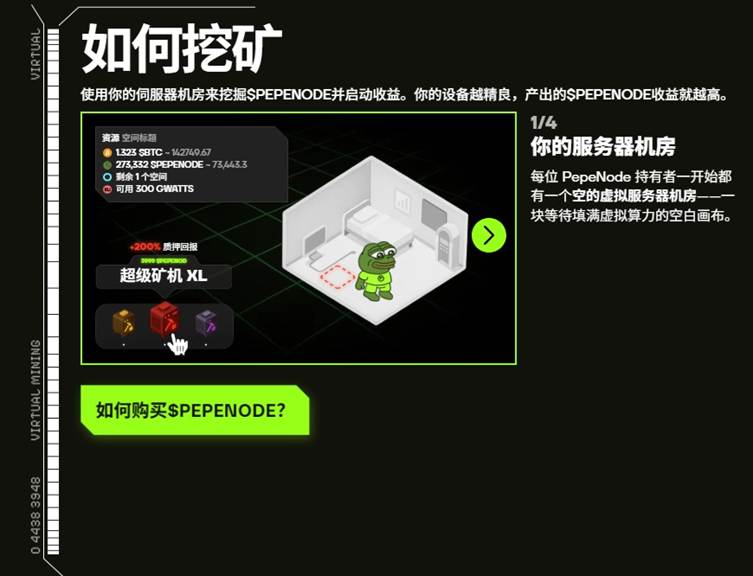 在 PepeNode 的虚拟挖矿玩法中,关于矿机、算力机房和电费这些现实世界的负担统统被抛到一边,玩家一上线,就会被丢进一间「空的数字机房」,接下来要怎么从零搭建起自己的虚拟矿场帝国,全凭你自己规划。