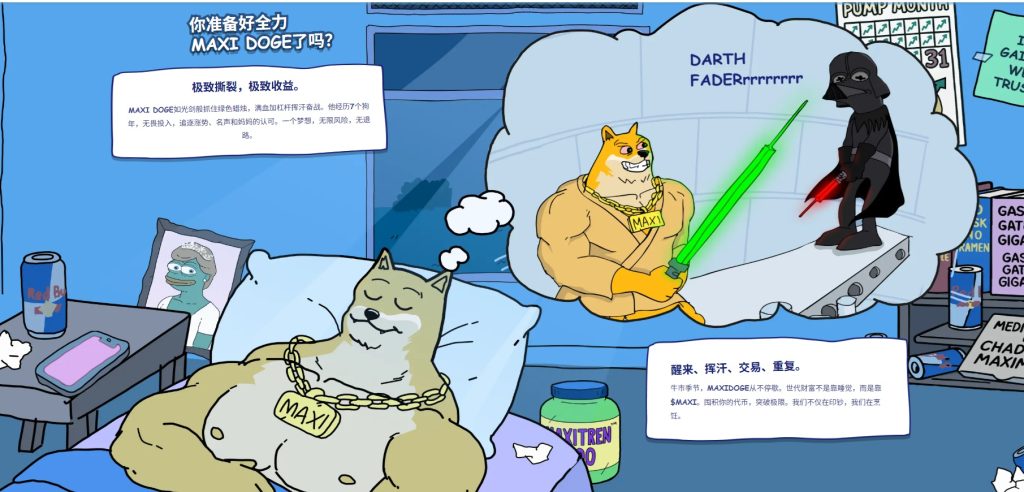 Maxi Doge 相当于给经典狗狗币文化上了一层“现代高杠杆滤镜”:主角是一只练到爆肌、迷恋高杠杆的 Doge,形象和现在加密圈的迷因文化高度贴合,自带传播属性。