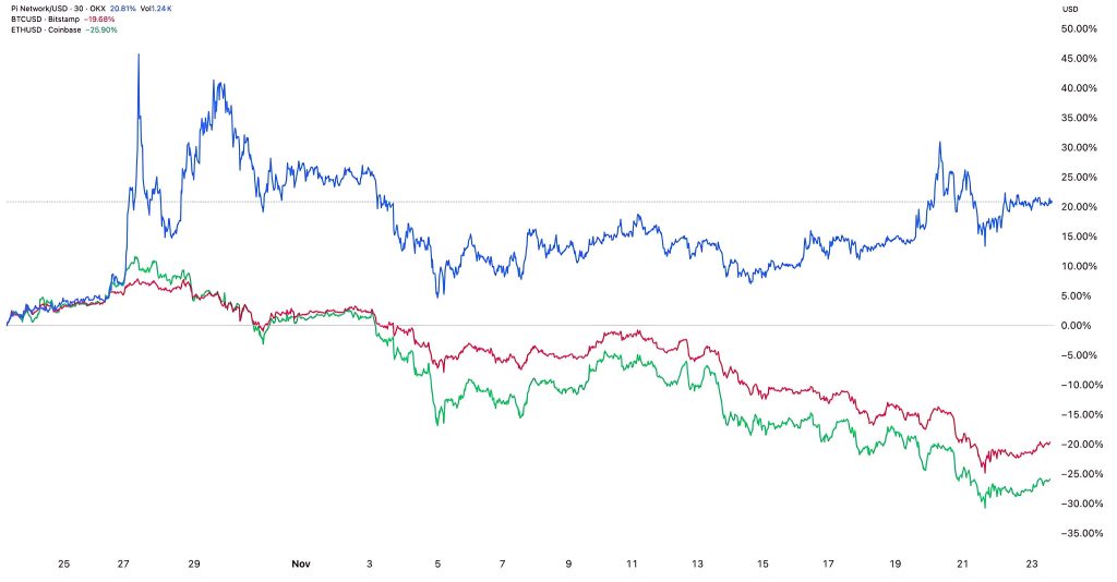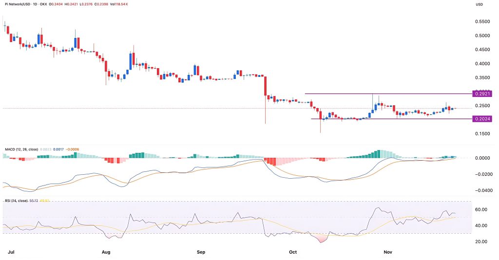 根据其日线图显示,Pi币价格自今年十月以来一直处于狭窄范围内。仔细观察会发现,该代币在0.2025美元形成了双底形态。自10月10日崩盘以来,它一直保持在该水平以下,当时行业中的强制清算飙升。而双底是一种非常看涨的形态,由两次下跌和一条颈线组成。在这种情况下,颈线位于0.2921美元,即今年10月的最高点。另外,Pi网络的价格还有其他看涨的催化剂。例如,布林带的三条线已经收窄,这可能在不久的将来引发短线挤压。