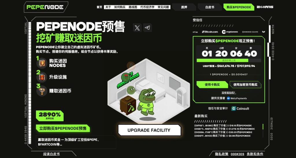 如果能有一枚专门用来挖掘迷因币的项目,那不是很棒吗?现在它真的来了!加密市场首个也是唯一的边挖边赚的项目 PepeNode ($PEPENODE),短短几天就已筹集56万美元。而且,这不是那种只会吹牛最后交付空气的项目。相反,你可以从第一天就开始挖矿。今天就参与PepeNode,马上成为迷因币的虚拟矿工。搭建矿机、赚取奖励、燃烧供给 —— 在 PepeNode 的游戏化挖矿系统中,这一切都能在代币上线之前实现,目前代币的价格为0.0010407美元。