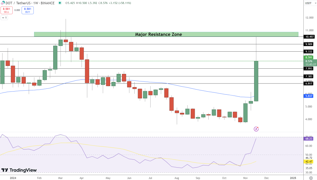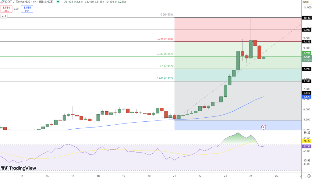 Polkadot当前处于关键价格区间,主要阻力位于$9.31(23.6%斐波那契回撤位)和$9.90。一旦突破这些位置,DOT有望冲击$10.50,这一重要心理和历史阻力位。
