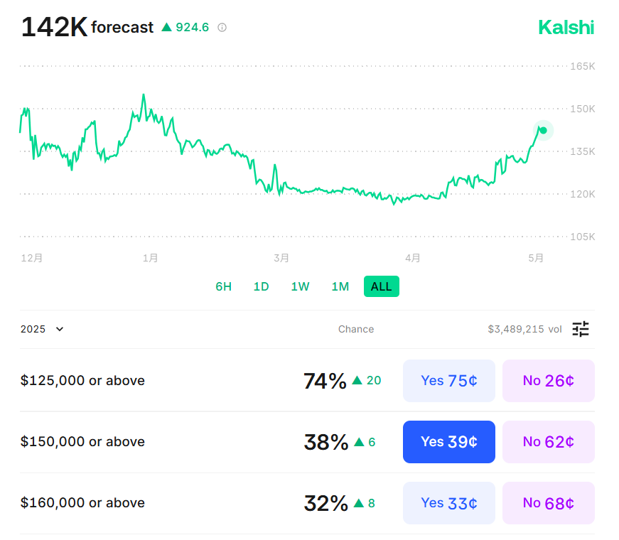 美国预测市场平台 Kalshi 在 5 月 22 日上调了对 2025 年比特币(BTC)价格的预测,称其可能最高升至 14.2 万美元。
