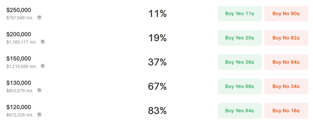 该平台指出,比特币在年末之前突破 15 万美元的概率为 38%。