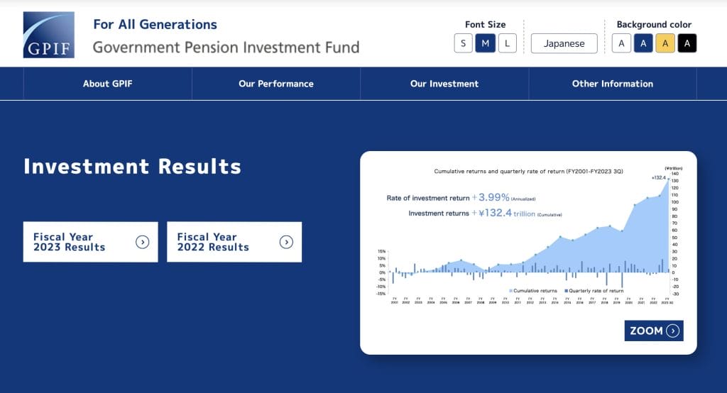 根据最新的财务报告,GPIF在上一季度实现了5.7兆日元的盈利。这一成绩得益于欧美地区的停止加息以及全球股市的整体上涨,使得上季度的投资回报率达到了2.62%。截至2023年12月底,与2023年9月底相比,GPIF的资产总额增加了2.46%,即增长了5.38兆日元,总资产达到了224.7兆日元。