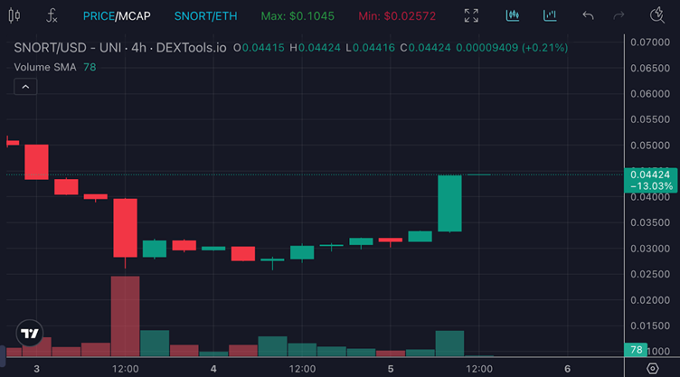 在即将上线的消息公布后,$SNORT 价格暴涨 59%,至 0.04417 美元,市场预期涨势仍将持续增强。
