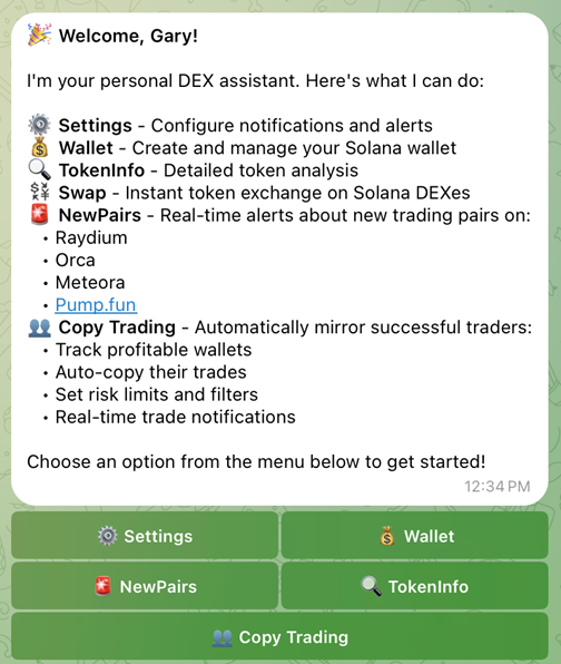 只需打开机器人,根据说明指南的提示操作,或点击接口上出现的按钮(例如「snipe」或「copy trade」),机器人就会一步步引导你完成策略设定与交易执行。