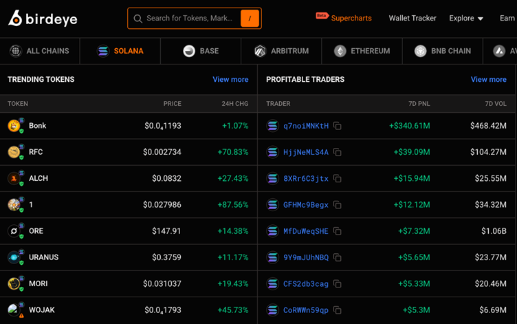 目前,许多散户交易者依赖像birdeye.so这类平台,该平台专注于提供 Solana 生态中的 Meme 币交易数据。其中的「盈利交易者榜单」已成为专职日内交易者的必备工具。