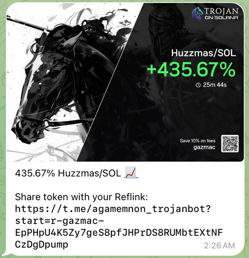 目前,跟单交易所带来的盈利效应 正吸引大量交易者涌入市场,特别是在 Solana 生态的 Meme 币板块,收益空间极具想象力。以下是一个昨日 Trojan 平台上的交易范例,充分展示了这种潜在的高额回报。