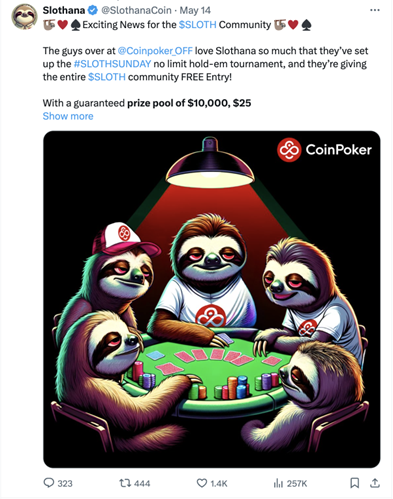 本周还披露了顶级加密扑克网站CoinPoker与$SLOTH合作举办了一场10,000美元奖池的比赛。比赛将于5月19日周日GMT时间19:00开始。