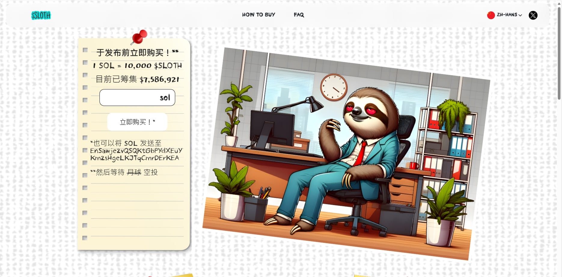 ⏰ Tired of the 9-5? So is Slothana!🦥Our office sloth is ready to ditch the daily grind and embrace the world of crypto trading. No more getting high on herb, just high on profits! Send SOL to help our sloth go from 420 couch surfer to $420m crypto chad! #slothana #memecoin