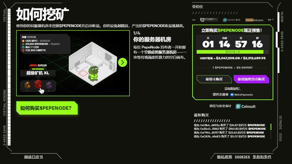 动能正快速加速。预售已突破200万美元,早鸟质押者仍可获得高达633%的APY收益。而且得益于内建的通货紧缩模型,其中所有用于节点和矿机的$PEPENODE代币70%将被烧毁,这种稀缺性支撑了代币的长期价值。