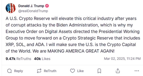 周日,特朗普在其社交平台 Truth 上宣布,美国正推进 加密战略储备(Crypto Strategic Reserve) 计划,其中包含 Ripple ($XRP)、Solana ($SOL) 和 Cardano ($ADA),推动相关币种价格大幅上扬。