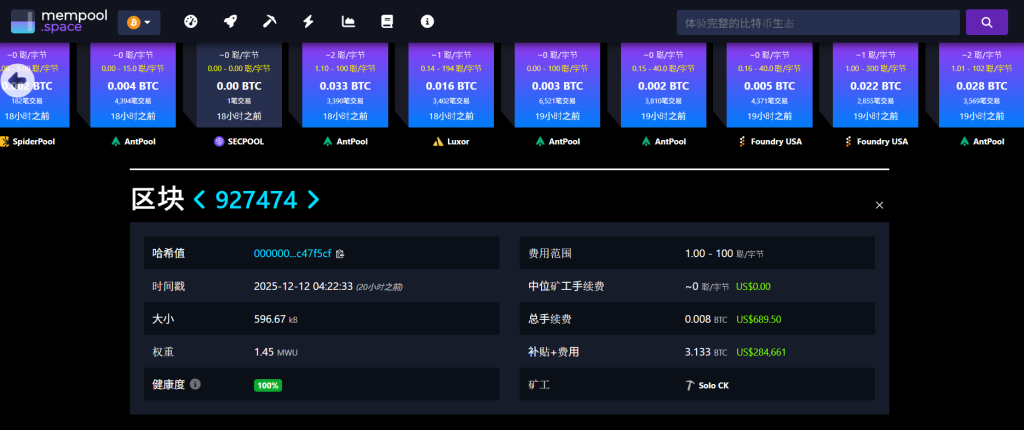 根据比特币区块浏览器Mempool数据,这位矿工透过使用CKpool独立挖矿软件成功开采第927,474区块,并获取3.125枚比特币(约值:28.4万美元)及交易手续费0.008枚比特币(约值690美元),合共3.133枚。