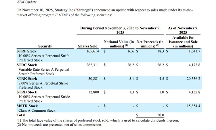 截至上周,该公司出售STRF股份165,614股;集资1,830万美元,尚余16.4亿美元可供发行;STRC已出售262,311股,筹得2,620万美元,尚余41.7亿美元;STRK股票售出50,881股,集资450万美元收益,尚有价值203.3亿美元可供发行及销售;STRD售出12,800股,筹得100万美元,尚余41.7亿美元。其A类普通股MSTR上周未售出任何股份,该ATM计划下尚余158.5亿美元额度。