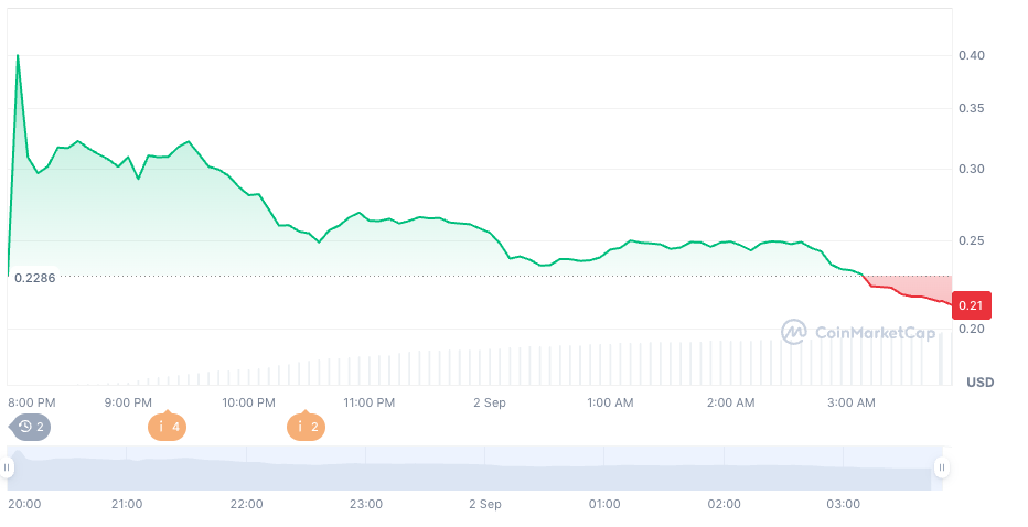 而根据CoinMarketCap数据,该代币的排名曾一度成为第23位大加密货币,截止撰写本文时,其排名已跌至第27位。此外,该代币在其总供应量1000亿代币的基础上,完全稀释市值为300亿美元。根据TradingView数据显示该代币目前的交易价曾一度升至0.4美元,来到9月2日凌晨时份,其价格已回落至0.2166美元。
