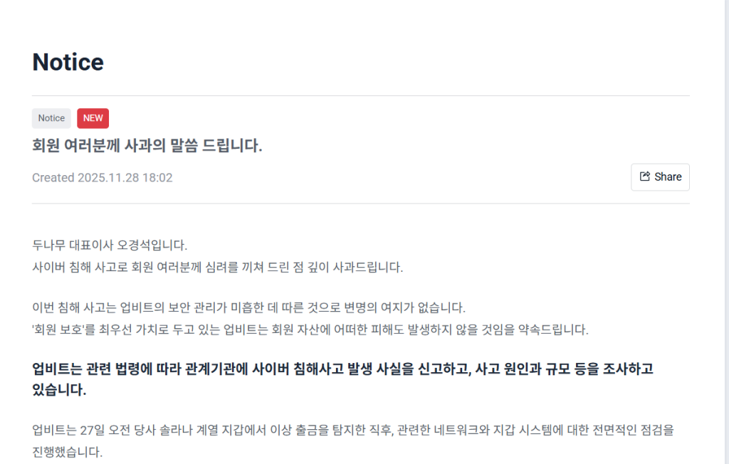 事件发生后,Dunamu执行长吴京锡发表公告向客户致歉,并指出经核查后,事件 造成的损失资产规莫约445亿韩元,其中涉及客户的资产386亿韩元,已冻结资产23亿韩元,公司本身资产59亿韩元,并承诺客户的损失,将由Upbit全额补偿。