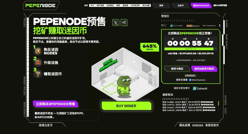现时一个名为 Pepenode($PEPENODE) 的新项目正迅速吸引目光,该专案以Pepe文化为核心灵感,结合挖矿与游戏化元素,在预售阶段已筹集超过200万美元。其独创的「Mine-to-Earn」机制让玩家透过游戏化挖矿参与生态,让迷因文化与DeFi收益形成结合。Pepenode的核心在于「节点挖矿」概念,用户可购买Miner Nodes建立虚拟挖矿机房,升级设备以提升收益,将传统被动挖矿转变为互动式参与。