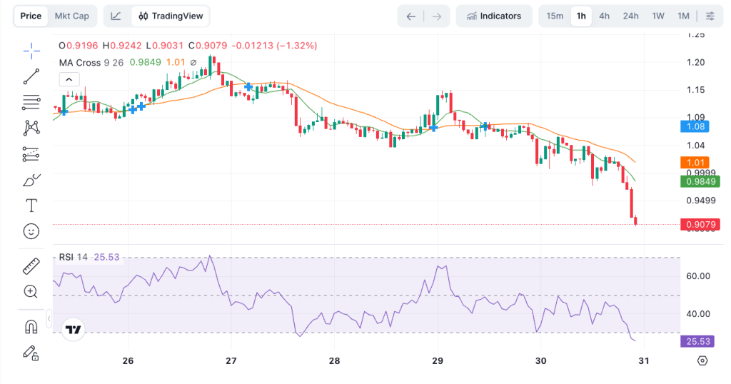 在12小时图表上,ASTER在一个下行扩大楔形内交易。这是一种看涨模式,通常在价格突破上方趋势线时会导致向上的突破。0.93美元的水平曾作为强有力的支撑并且仍然保持。如果ASTER能保持在这一水平以上,下一个立即目标是1.12美元,接下来是1.28美元。突破1.79美元的果断突破将确认更大的趋势反转。在10月10日至10月29日之间,价格形成了更低的低点,而相对强弱指数(RSI)形成了更高的低点。这是一个看涨的背离,通常标志着反弹的开始。这一设置,加上鲸鱼累积的上升,支持了买家可能重新控制的想法。