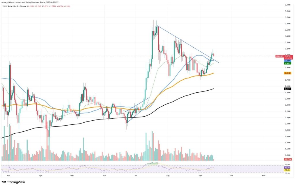 根据公司市值数据,XRP的市值在上周一度超过Shopify、小米和花旗集团。Shopify支持数百万个在线商店,小米是一家中国主要科技公司,而花旗集团管理着数万亿资产。尽管在全球范围内活跃,XRP的价值上升使其在这些企业巨头之前。此次上涨随着周增长一度达到10%以上,这种替代货币的交易价格首次突破3.10美元,许多分析师将此增长视为数字资产更广泛复甦的一部分。但随着XRP价格在9月14日的回落,其市值已再次落后于前3者。