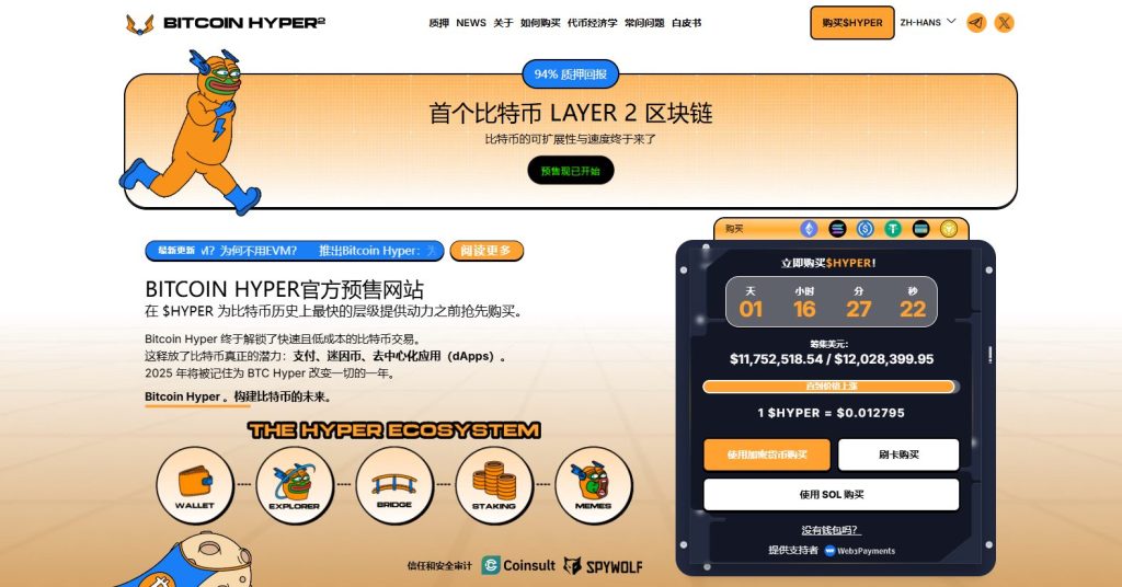 通过结合比特币无与伦比的安全性与Solana的高性能框架,Bitcoin Hyper打开了全新的应用场景,包括无缝比特币跨链桥接与可扩展的去中心化应用dApp开发。团队高度重视信任与可扩展性,项目已通过Consult审计,为投资者提供了坚实的信心保障。项目热度正快速升温,预售已接近1200万美元,仅剩下有限配额。目前HYPER代币的价格仅为0.012795美元,但随着预售推进,这一价格将逐步上调。投资者可通过Bitcoin Hyper官方网站使用加密货币或银行卡购买$HYPER代币。