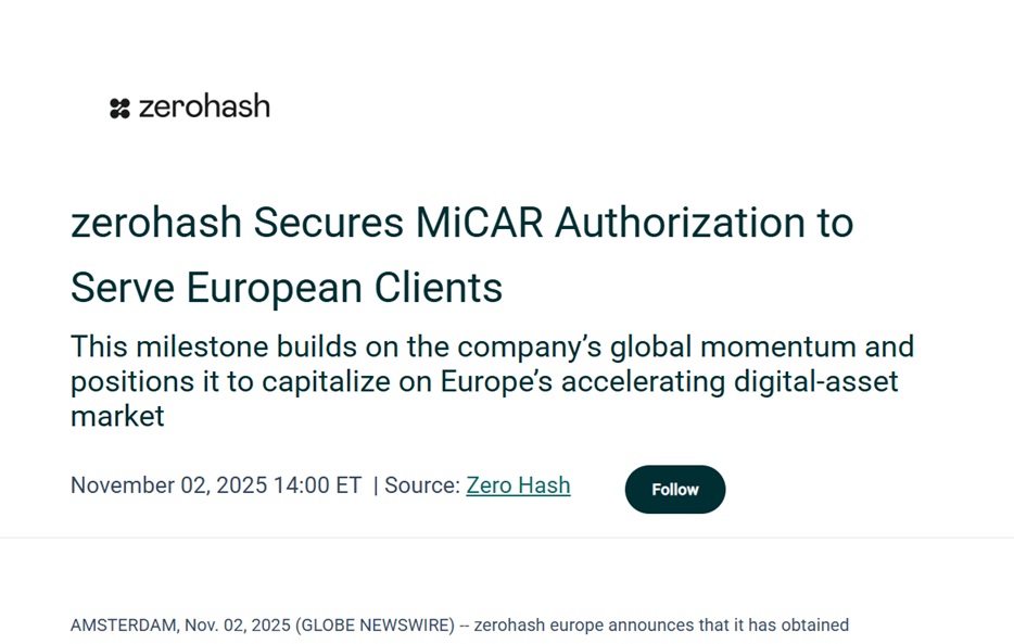 Zerohash欧洲分公司宣布,从荷兰金融市场管理局(AFM)获MiCA执照,这个执照将容许公司向欧洲经济区内33个国家内的银行及金融科技机构,提供稳定币以及加密货币产品。荷兰金融市场管理局的官方注册处也确认Zerohash 成为已注册的加密资产服务供货商(CASP)。该批准使Zerohash的欧洲分支机构能够为探索代币化资产、稳定币和其他基于区块链的金融产品的组织提供核心支持。