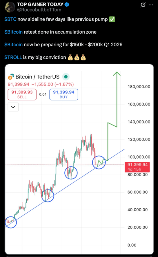 X 上另一位热门分析师 Top Gainer Today 的中长期看法也类似。他认为,比特币最终有机会冲击 Fundstrat 的 Tom Lee 和 BitMEX 创始人 Arthur Hayes 提到的那种激进目标价——大概 20 万美金一枚的区间,只是他预期的节奏会更慢一些,更有可能拖到 2026 年一季度去兑现。