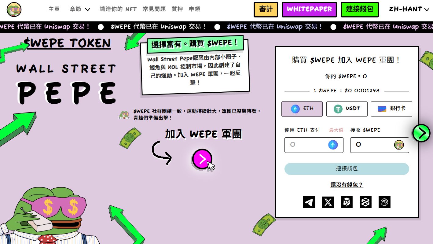 Wall Street Pepe($WEPE)是一款结合华尔街与Pepe文化的meme幣項目,属于2025年迷因幣板塊的热门發幣平台代表。自6月1日以来,$WEPE價格已暴涨超过600%,总市值等數據突破2570万美元,成为本轮迷因币市場熱潮的焦点。其社群在X平台迅速成长至5.6万名用戶,并以自创迷因內容引发网路热议,展现了用戶對該項目的高度興趣。