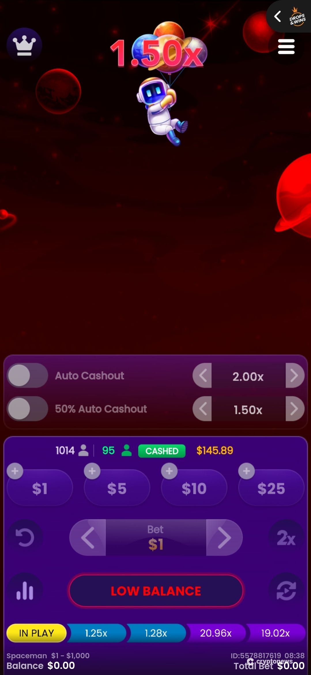 Spaceman is a crash gambling game set in outer space, where players guide a spaceman floating upwards. Similar to other crash games, the multiplier on this crash game increases over time, and players must decide when to cash out before the spaceman encounters hazards or obstacles and crashes.